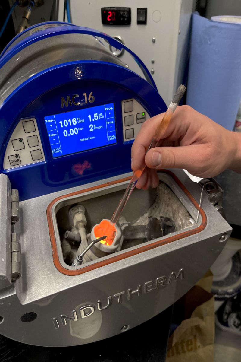 Nach dem Ausschmelzen des Wachses entsteht eine präzise Hohlform, die einmalig mit flüssigem Edelmetall ausgegossen wird.